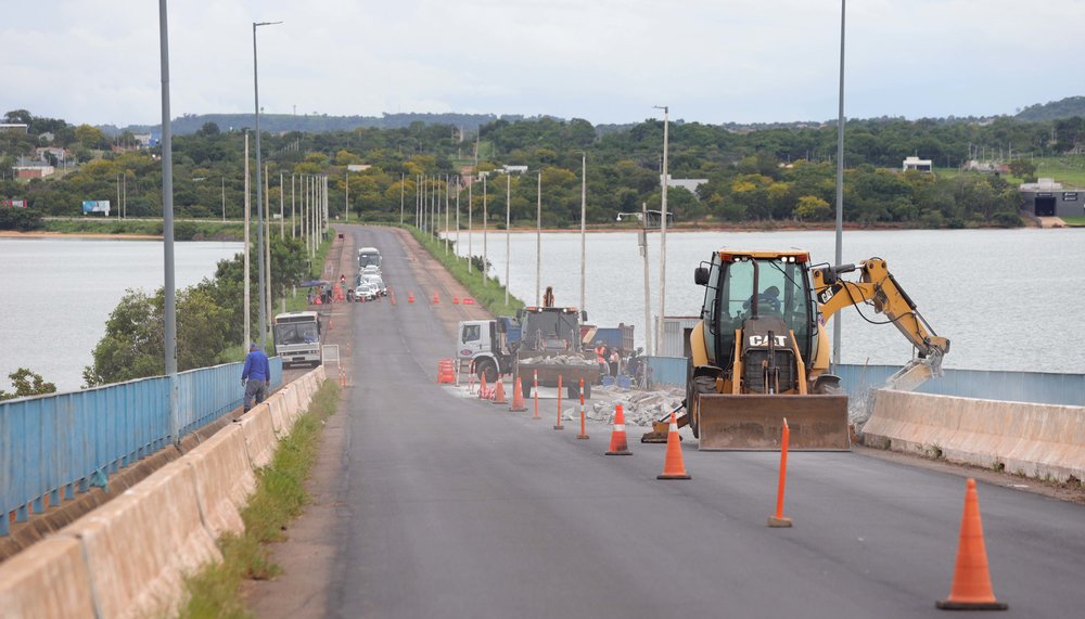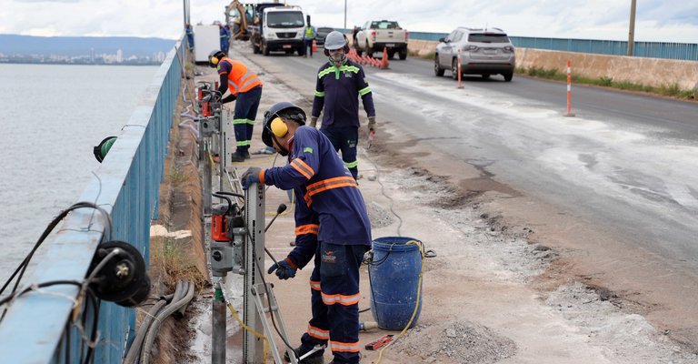 As obras de requalificação da Ponte Governador José Wilson Siqueira Campos seguem em ritmo acelerado e dentro do cronograma estabelecido. Atualmente, 34% do projeto já foi executado, com etapas relevantes concluídas, como a implantação do colchão drenante e a recuperação do pavimento asfáltico.